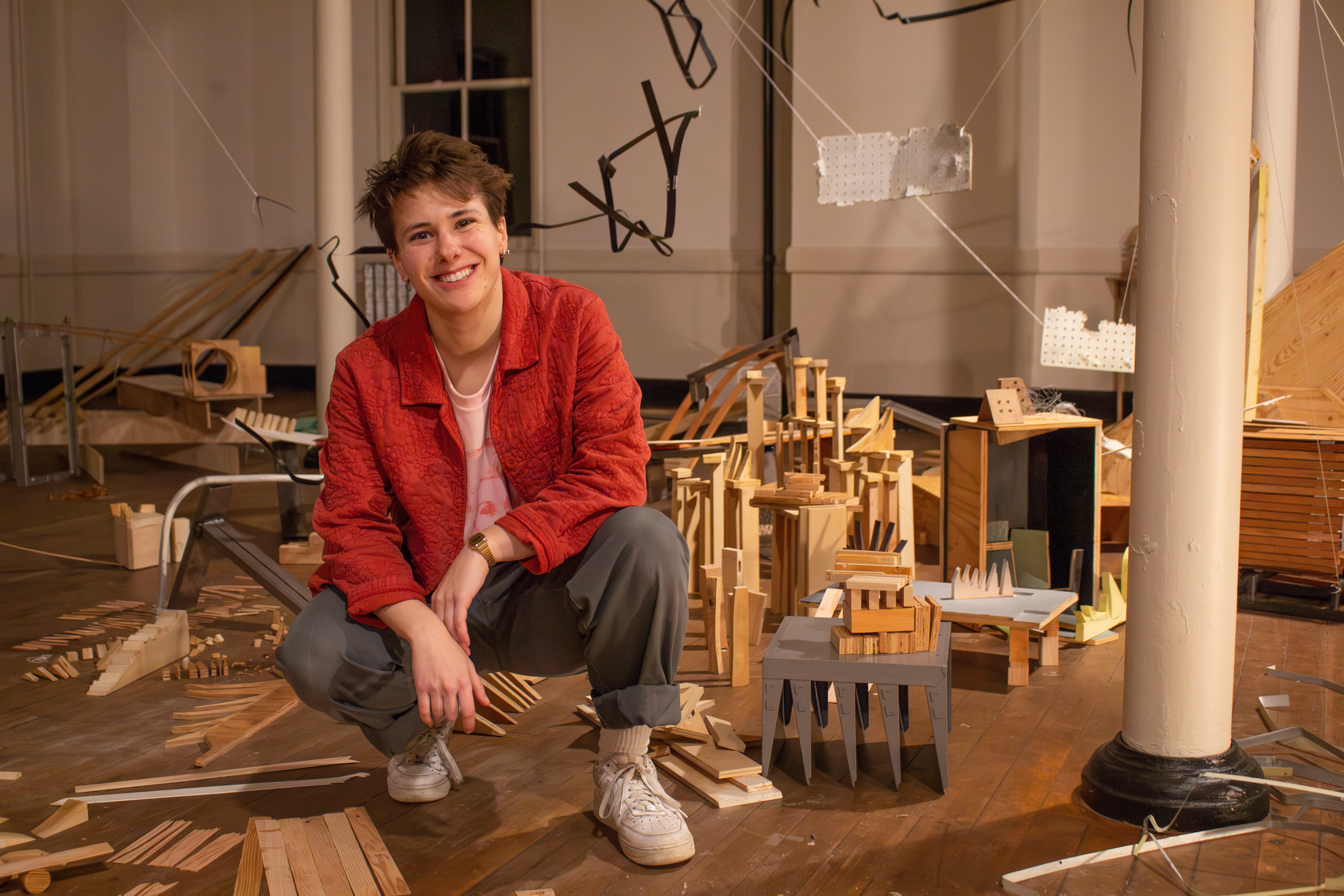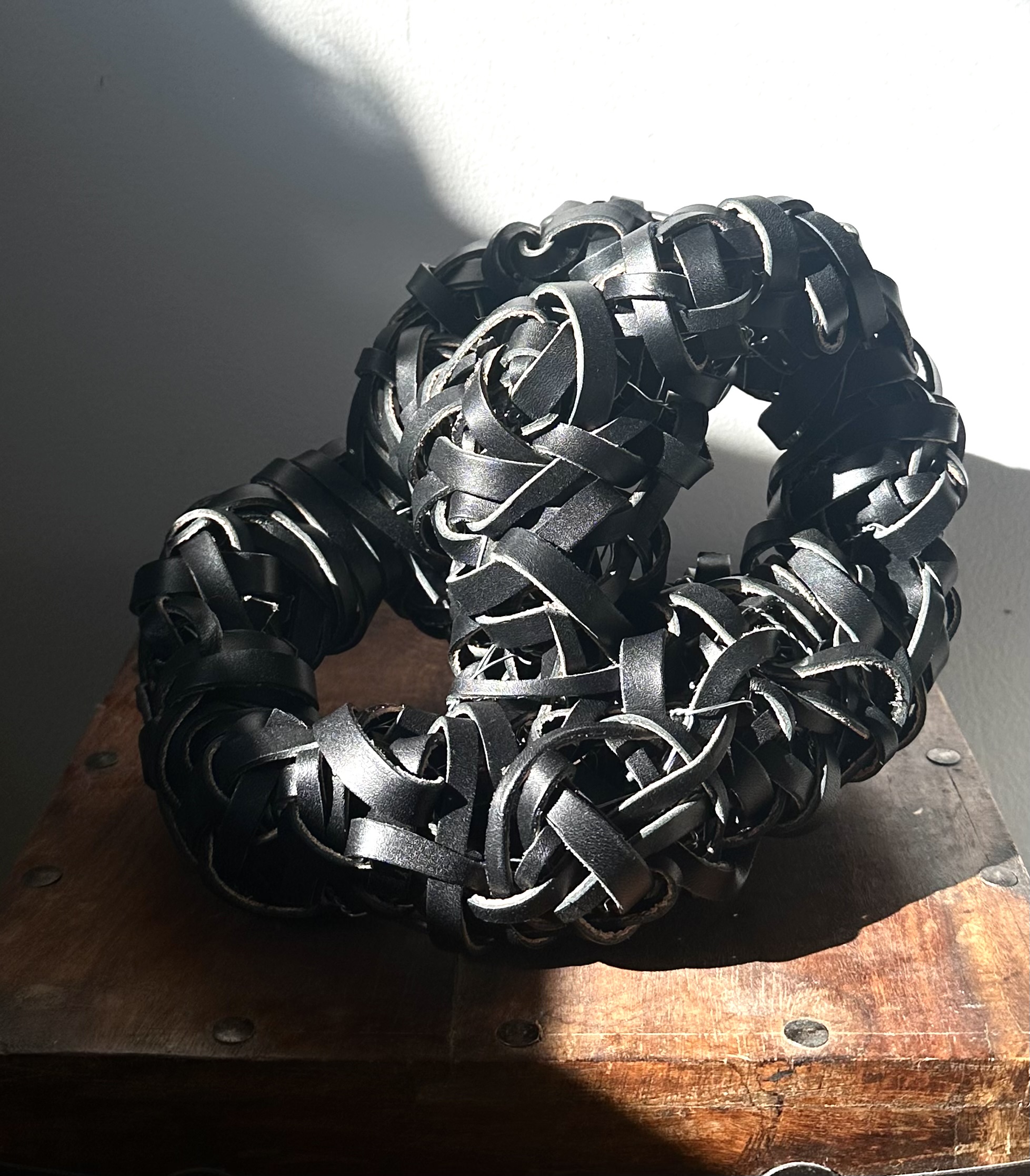 Medium: hand woven discarded leather and sculpted metal frame