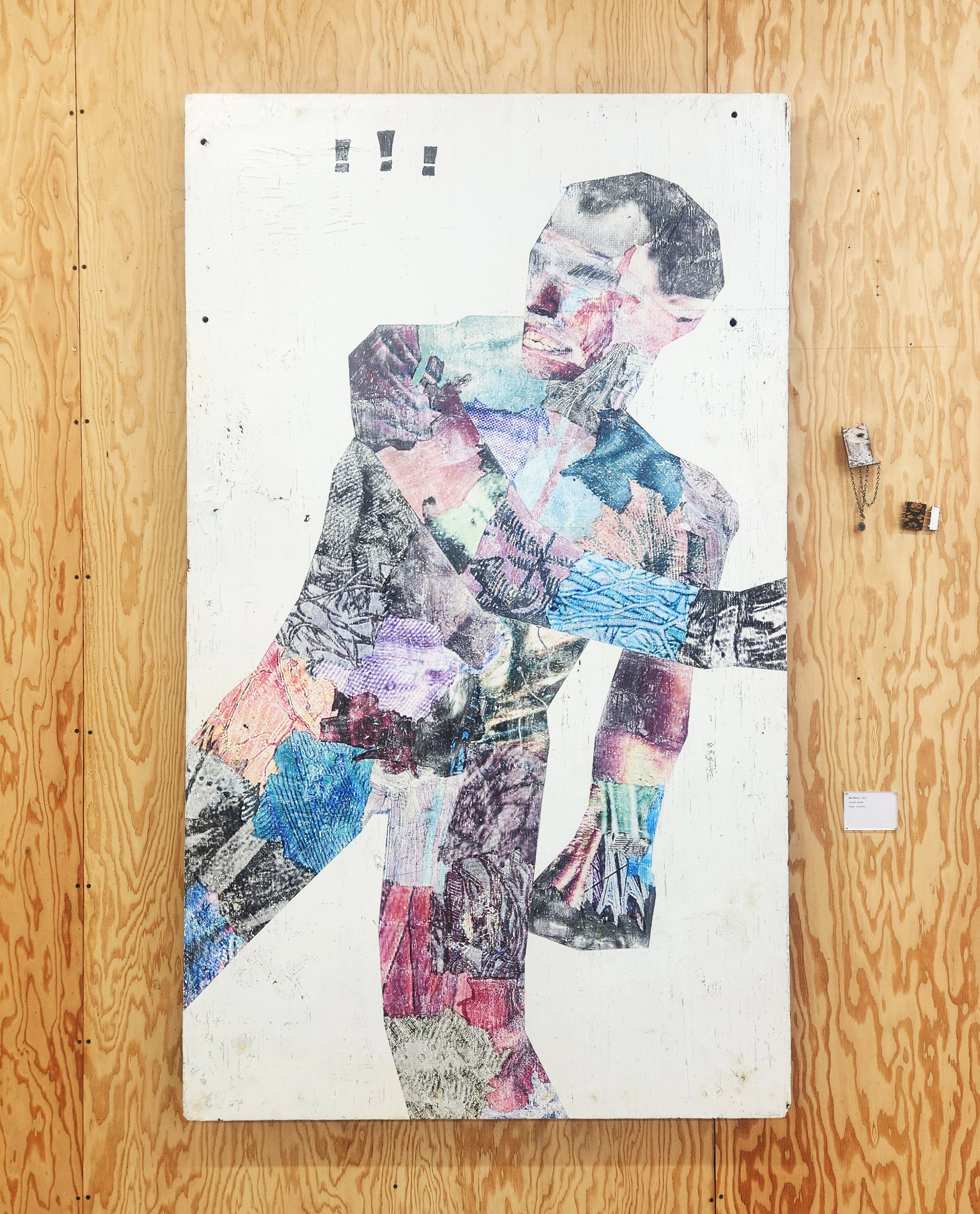Medium: oil, spray paint and collage on recycled canvas